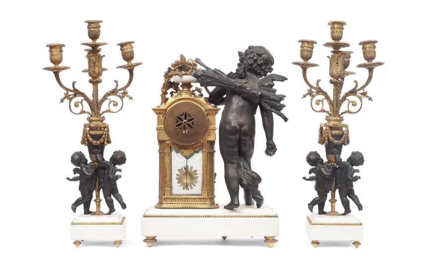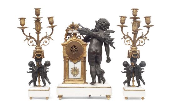 AN EARLY 20TH CENTURY FRENCH FIGURAL CLOCK GARNITUREthe mantel clock decorated wwith a standing figure of Cupid holing a torch, beside the gilt metal clock case surmounted by a urn of roses, with glazed front and back panels revealing the sunburst pendulum within, raised on a white marble plinth and toupie feet, the white enamelled dial with Arabic numerals, the twin train movement signed S. Marti 1900, with outside countwheel, the clock set with a pair of matching Louis XVI style candelabra also decorated with cherubs and on white marble bases,the clock 49cm high the candelabra 53cm high (3)