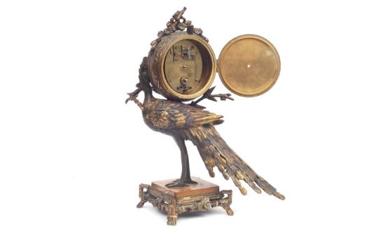 ATTRIBUTED TO L'ESCALIER DE CRISTAL, PARIS: A FINE LATE 19TH CENTURY FRENCH PEACOCK CLOCKmodelled as a peacock holding a sprig of blossom in its beak, supporting the circular clock case with Japonisme style relief cast decoration and surmounted by further blossom, the Arabic dial finely painted with boats on a river within a shaped panel and gilt flowers on a turquoise ground, raised on an agate, square base over a naturalistically cast plinth modelled as bamboo, the single train timepiece movement winding from the back and with vertically mounted lever platform escapement,32cm highThe movement is winding and ticking but not fully tested or guaranteed.Footnote:This model can be attributed to L'Escalier de Cristal as some very similar examples are signed to the dial. The use of expensive techniques and materials (such as silvering and agate) and the re-interpretation of Oriental themes with the Japonisme style are typical features of clocks by L'Escalier de Cristal. For other examples at auction see Bonhams, London, 5 December 2014, lots 103 and 124.