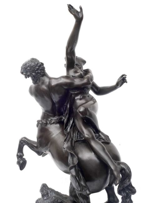 A LARGE 19TH CENTURY ITALIAN BRONZE GROUP OF NESSUS AND DEIANIRA AFTER GIAMBOLOGNAthe Grand Tour type bronze depicting the rearing satyr abducting the nude maiden, on a naturalistic base over a beaded, later gilt decorated plinth,79cm high