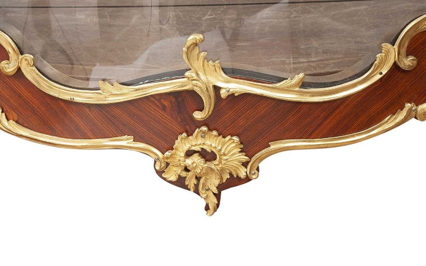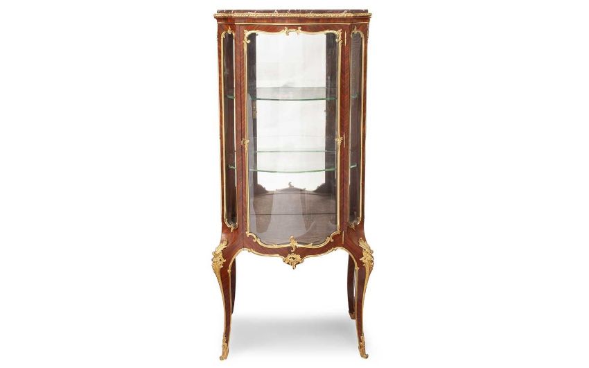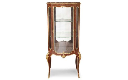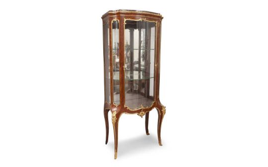PAUL SORMANI (FRENCH, 1817-1887): A FINE GILT BRONZE MOUNTED KINGWOOD VITRINENapoleon III period circa 1875, in the Louis XV revival style, the display cabinet of small proportions, decorated with ormolu foliate mounts, the central glazed door opening to reveal an engraved brass plaque signed 'PAUL SORMANI/10 r. Charlot Paris', with two glazed shelves and with a Breccia marble top,153.5cm high x 39.5cm wideAuction comparable: See Sotheby's, New York, 22 April 2010, lot 137, $11,250.