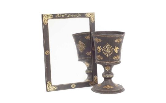 A GOLD DECORATED ISLAMIC GOBLET AND STANDin the style of damascened steel, decorated with arabic inscriptions and stylised arabesque motifs, the goblet on knopped stem over domed foot, the mirrored stand of rectangular form, the underside also with gilt decoration, of patinated steel,the goblet 22.5cm high, the stand 30cm wide