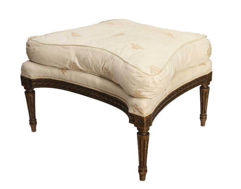 A LOUIS XVI STYLE GILTWOOD UPHOLSTERED STOOLof inswept outline, raised on four tapering, fluted legs, with cream and leaf upholstery,67cm wide x 59cm deep x 43cm high Please note: This lot is stored off-site, please contact us to collect.