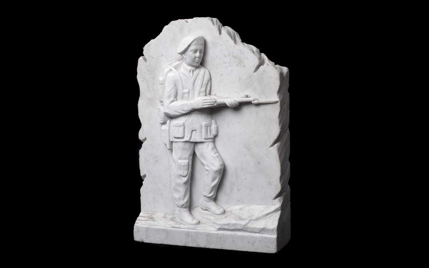 AN EARLY 20TH CENTURY MARBLE RELIEF OF A WW1 SOLDIERpossibly a design for a war memorial, the soldier with backpack and holding a bayonet, with a rusticated edge to the thick marble slab and a plinth base,46cm high x 31cm wide x 10cm deep Please note: This lot is stored off-site, please contact us to collect.