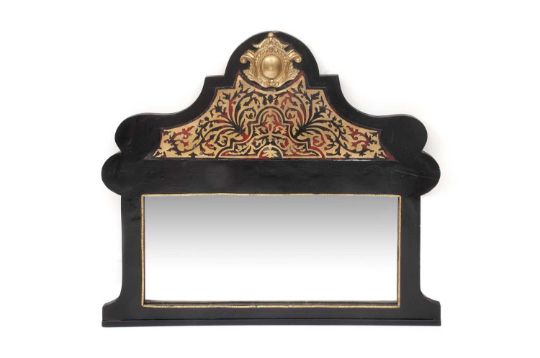 A BOULLE STYLE FAUX TORTOISHELL AND GILT BRONZE MOUNTED WALL MIRRORof scrolling outline, the crest with painted, faux red tortoiseshell and cut brass decoration below a gilt cartouche,77cm wide x 72cm high