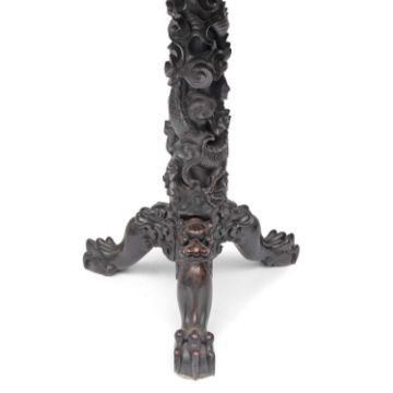 A 19TH CENTURY CHINESE CANTON HARDWOOD AND PORCELAIN MOUNTED TABLEthe circular top inlaid with a Famille Verte porcelain panel depicting various interior scenes interspersed with birds amongst flowering plants, centred by a floral bouquet, flanked by hard wood table top carved with flower heads and scrolling tendrils to the border, over a pierced foliate carved frieze, raised on a profusely carved stand with scrolling dragons amongst bulbous clouds, on a tripod base, the three legs carved with dragon heads and terminating in paw feet,the top 54cm diameter, 75cm high