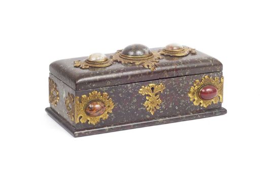 A 19TH CENTURY SERPENTINE MARBLE, ORMOLU AND HARD STONE INLAID CASKETin the Renaissance Revival style, of rectangular form, with engraved gilt brass mounts enclosing hard stone cabochons in banded agate and other stones, the interior with purple silk lining,28cm wide x 12cm high