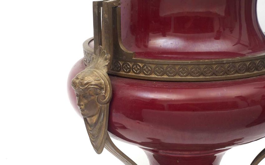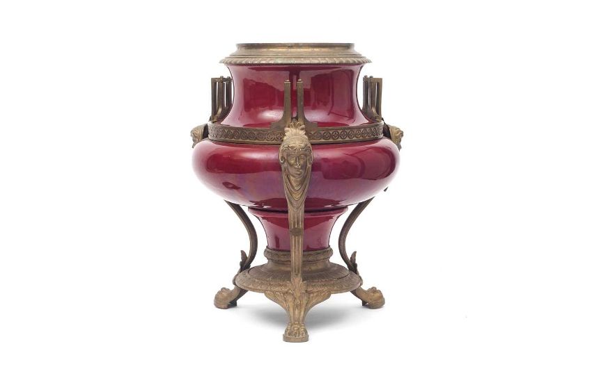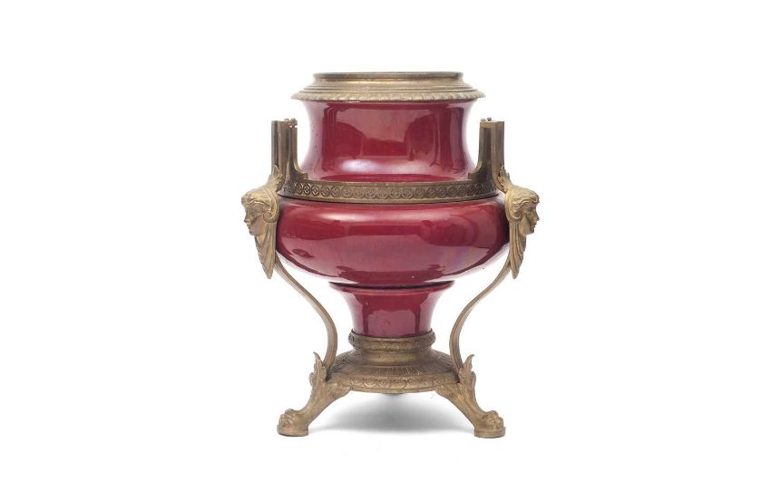 AN EARLY 20TH CENTURY GILT BRONZE MOUNTED SANG DE BOEUF VASEthe urn with red glazed body with associated tapering foot and with hole drilled to the bottom, with French bronze mounts, on triform stand with three classical female masks and raised on three paw and acanthus cast feet,43cm high x 35cm wide