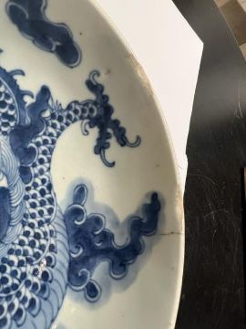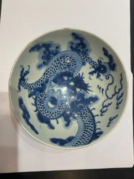 A COLLECTION OF FOUR PIECES OF 19TH CENTURY CHINESE CERAMICScomprising a blue and white bowl decorated with dragons, a blue and white plated decorated with a willow tree, a small blue and white ginger jar and a Canton export Famille Rose porcelain teapot,8cm high, 22cm wide, 12.5cm high and 14cm high respectively, (4)