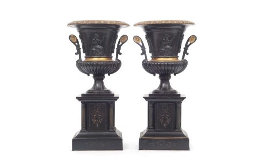 A PAIR OF 19TH CENTURY PARCEL GILT, BRONZE AND MARBLE CLASSICAL URNSof Campana form, each with a pair of scrolling handles, and classical scenes cast in relief to the bodies, raised on spreading socles over architectural plinth bases with incised gilt decoration,42cm high (2)