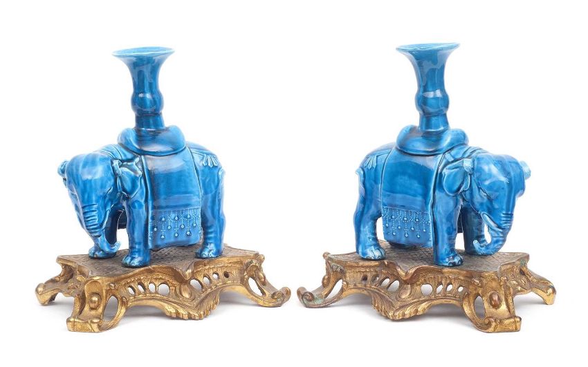 A PAIR OF 19TH CENTURY CHINESE QING DYNASTY TURQUOISE GLAZED ELEPHANT CANDLESTICKSeach standing elephant supporting a vase shaped nozzle, raised on later French gilt bronze Rococo style bases cast with pierced foilage and C scroll decoration,the elephants 20cm high, 24cm high overall (2)