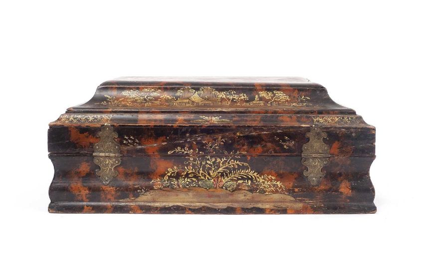 A FINE 18TH CENTURY CHINOISERIE DECORATED AND FAUX TORTOISESHELL PAINTED BOXthe Boîte à perruque or wig / toilette box of rectangular form with bombe shaped base, painted throughout to resemble tortoiseshell and with gilt Chinoiserie decoration of Chinese figures, pagodas and trees, with foliate engraved, gilt metal hinges and escutcheon, with key, the interior later silk lined,29cm wide x 21cm deep x 12cm high