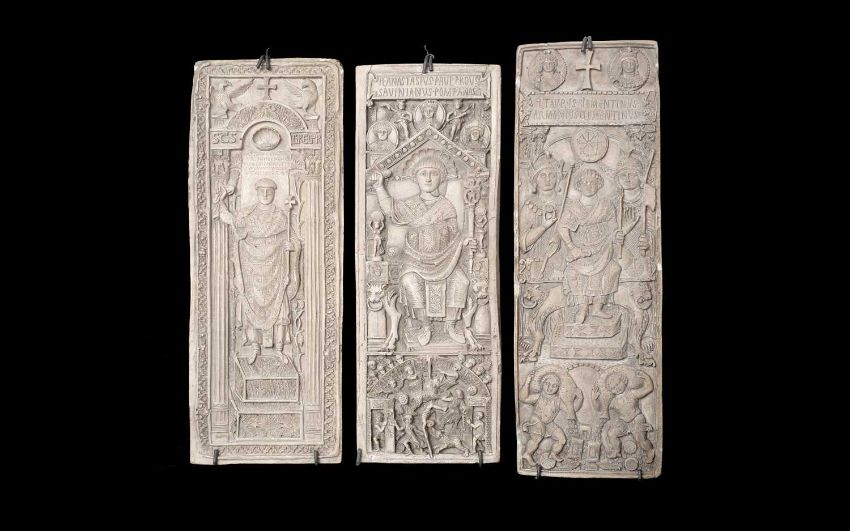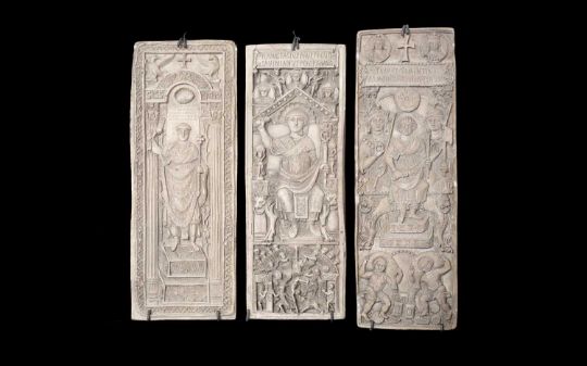 A SET OF THREE 19TH CENTURY PLASTER RELIEFS AFTER ROMAN DIPTYCHS BY FRANCHI & SONeach rectangular panel from an ancient diptych, cast in relief with, one with the seated figure of Clementinus (513AD), another with standing figure in Roman consular robes, and another similar, each with an old paper lablel to the reverse, inscribed '6th century diptych (one leaf), of.... 517, Kunstkammer Berlin', the backs of the panels stamped 'G. FRANCHI & SON 15 MYDDLETON ST LONDON', and numbered two also with old paper labels printed with catalogue descriptions,each panel 37cm high x 14cm wide (3)