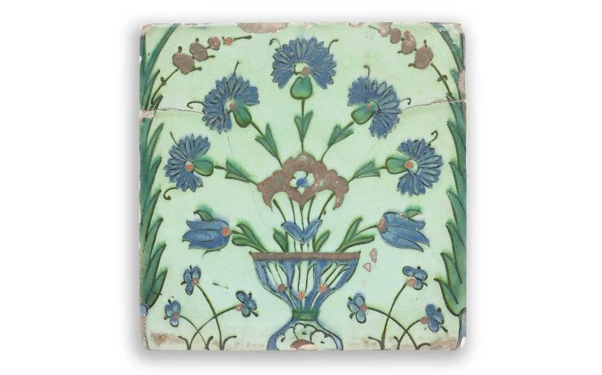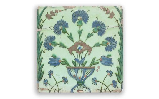 A 17TH / 18TH CENTURY OTTOMAN IZNIK TILEof square form, depicting a vase of carnations and tulips on a green ground,25cm wide