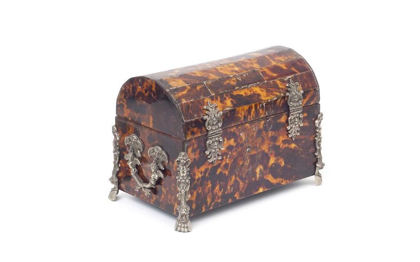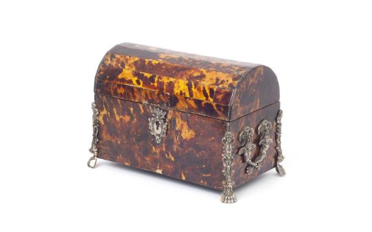 X AN 18TH CENTURY DUTCH COLONIAL TORTOISESHELL AND SILVERED METAL MOUNTED CASKETwith tortoiseshell veneers throughout, the domed and faceted top over the rectangular box, with silvered metal mounts to the corners cast as putti caryatids over paw feet, the escutcheon cast with a crown over a pair of putti, the handles modelled as grotesque, winged mermaids with tails entwined, issuing from the mouths of Green man masks, the interior silk lined, with key,23cm wide x 13cm deep x 15cm highThis lot is subject to CITES export regulations due to the tortoiseshell.