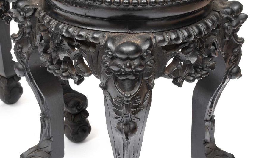 A PAIR OF 19TH CENTURY CHINESE CARVED HARDWOOD AND MARBLE MOUNTED TABLESthe low tables or stands with circular tops inlaid with coloured marble and with beaded wooden mounts, raised on four legs carved with dragon heads to the top and claw and ball feet,the tops 27cm diameter, 45cm high (2)