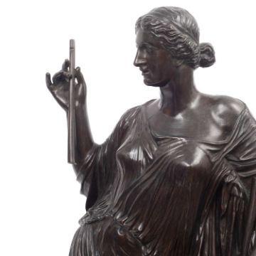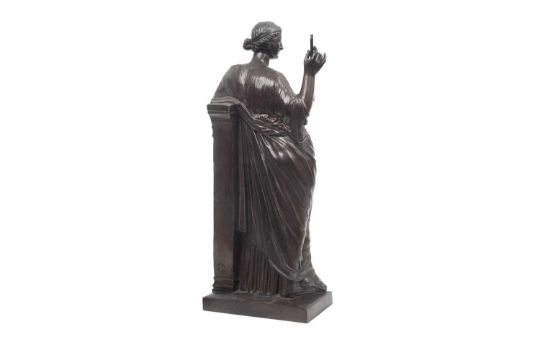 ATTRIBUTED TO F. BARBEDIENNE: A LARGE 19TH CENTURY BRONZE FIGURE OF EUTERPEAfter the Antique, the classical maiden leaning against a foliate decorated pedestal and holding a flute in her right hand, raised on a rectangular base inscribed 'EUTERPE' and with REDUCTION MECHANIQUE A. COLLAS BREVETE foundry stamp,69cm highFoonote:The A. Collas Brevete foundry stamp is usually found on Barbedienne bronzes and Ferdinand Barbedienne was known to have cast this model.