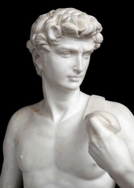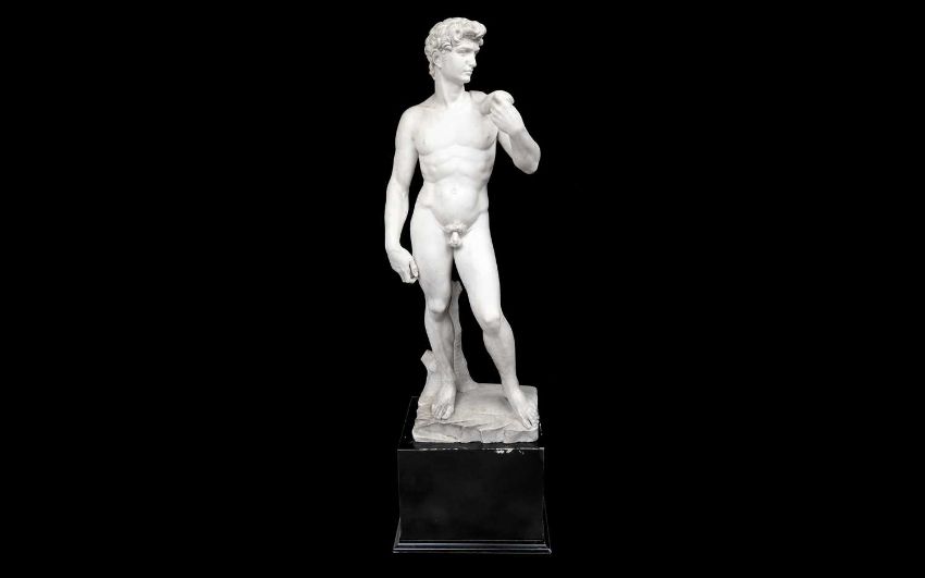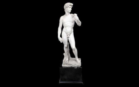 A LARGE 19TH CENTURY ITALIAN CARRARA MARBLE FIGURE OF DAVID AFTER MICHELANGELOthe free standing, nude figure standing a contra posto on a naturalistic base modelled with a tree stump, raised on an ebonised plinth,the marble 125cm high, 168cm high overall