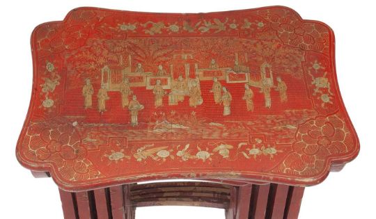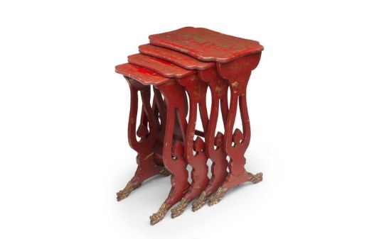 A 19TH CENTURY CHINESE RED LACQUERED AND GILT DECORATED NEST OF TABLESthe set of four tables in the Regency style, of shaped outline and each with twin lyre shaped supports over a pair of splay legs, decorated throughout with red lacquer and with gilt Chinoiserie decoration of figures and ferns,50cm wide x 34cm deep x 69cm high (4)