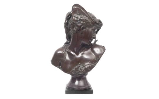 HELENE BERTAUX (FRENCH, 1825-1909): A BRONZE BUST OF A GIRL WITH DRAGON FLYsigned 'Me. Leon Bertaux', on a rouge marble socle over a black marble base,62cm high.Footnote:Helene Bertaux was a poineering advocate for female artists, working in Paris in the late 19th century, she was instrumental in establishing the first sculpture school for women. She founded the Union of Women Painters and Sculptors in 1881, and she also set up several monetary awards for women artists, and campaigned successfully to force the Ecole des Beaux-Arts to admit women. In 1896 she was the first female member elected to the Ecole des Beaux-Arts. At the Universal Exhibition of 1889, she was the first female sculptor to receive a gold medal, and she also won several gold medals at the Paris salon.The present bronze bust is loosely based on her marble bust of Spring, which was exhibited at the Chicago World's Fair in 1893 (please see additional images). She signed her work 'Madame Leon Bertaux' as that was her husand's name.