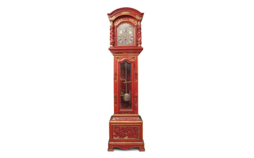 AN EXCEPTIONAL LATE 19TH CENTURY CHINESE CARVED AND RED LACQUERED LONGCASE CLOCKthe Chinese case with parcel gilt decoration and painted and carved in relief throughout, with hood with free standing columns to the front angles carved with dragons, the hood side panels also carved with Chinese figures flanked by geometric borders and bats, the trunk with arched and bevelled glass door, the back panel within the case also finely carved with hunting scenes, pagodas and trees on a gilt ground, the plinth base also with carved panels to the front and sides, the English break-arch silvered dial with engraved decoration of acanthus leaves, the boss engraved with a swallow within a roundel, the single train, timepiece movement, weight driven and with triangular plates and deadbeat escapement, with pendulum and weight,219cm high