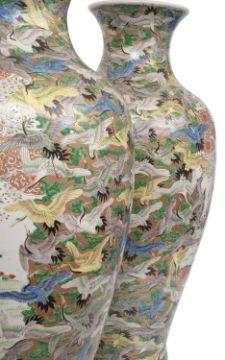 A MASSIVE PAIR OF JAPANESE MEIJI PERIOD AODE KUTANI PORCELAIN VASESthe late 19th century vases of baluster form, each decorated profusely with flying cranes of various colours amongst green painted cloud scrolls on a gilt ground, flanking panels depicting Japanese ladies in silk kimonos, restored,77cm high (2)