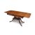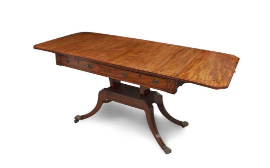 A REGENCY MAHOGANY AND EBONY LINE INLAID SOFA TABLEthe top inlaid with a geometric line design, with drop flap ends, each side fitted with a drawer beside a faux drawer, with ormolu ring handles, raised on a quadripartite base with four splay legs on gilt brass paw feet and castors,105cm wide with sides dropped, 66cm deep x 74cm high, 165cm in length when extended