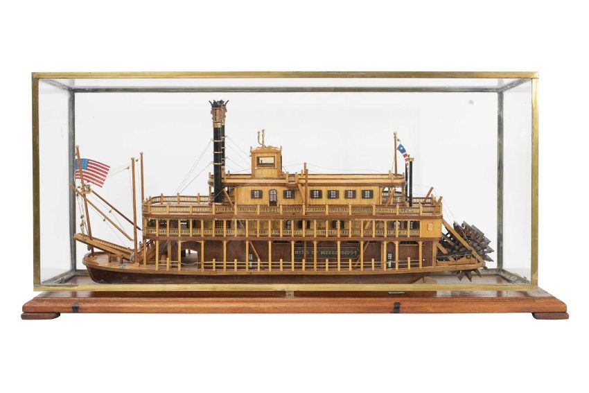 A WOODEN MODEL OF A MISSISSIPPI PADDLE STEAMERthe highly detailed model boat titled 'The King of Mississippi', made of wood and brass, mounted in a brass and perspex display case with wooden base,the case 77cm wide x 35cm high