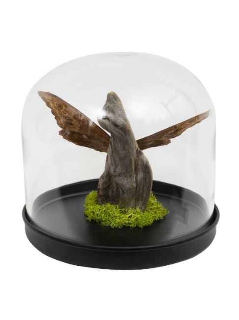 A GIANT BLUE MORPHO BUTTERFLY UNDER A GLASS DOMEof Taxidermy / Osteology interest, the Giant Blue Morpho Butterfly (Morpho didius) from Peru, displayed on driftwood with moss at base, under glass dome with black metal base, exhibiting the stunning electric blue colours this species is famous for,the dome 16cm high
