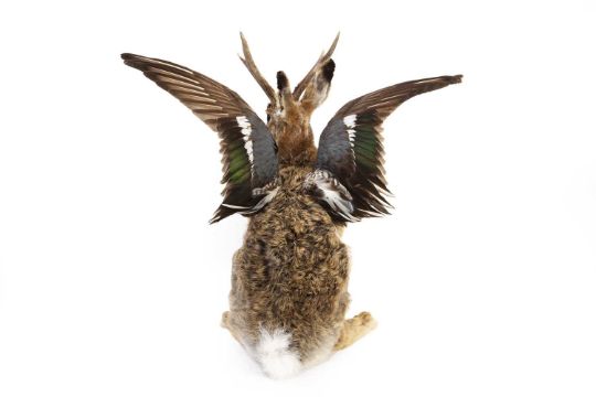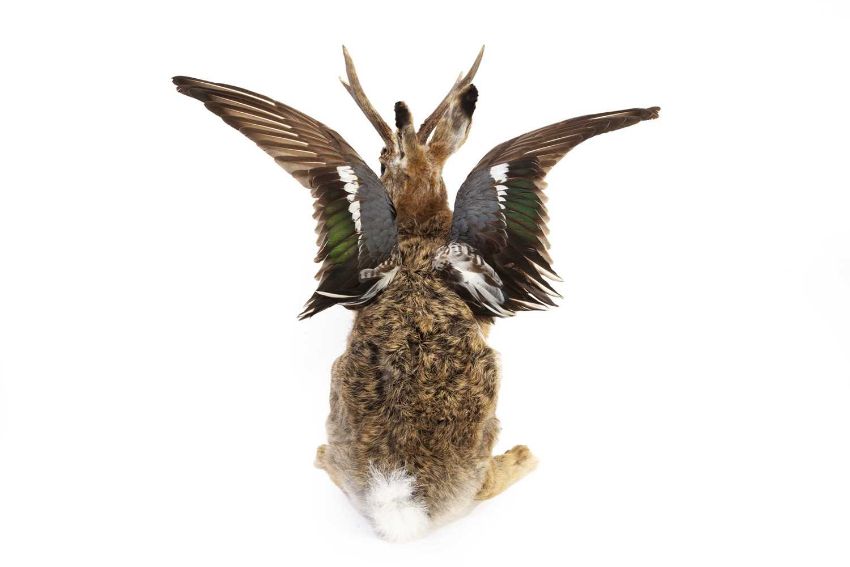A TAXIDERMY 'WOLPERTINGER'free standing sat full mount, a particularly fine example of a rare male 'Wolpertinger', from German folklore, the 'Wolpertinger' is a mythical hare-like animal, with the wings of a bird; antlers of a deer; and fangs of coyote, said to inhabit the alpine forests of Bavaria and Baden-Württemberg in Southern Germany, no wunderkammer is complete without one,45cm high.