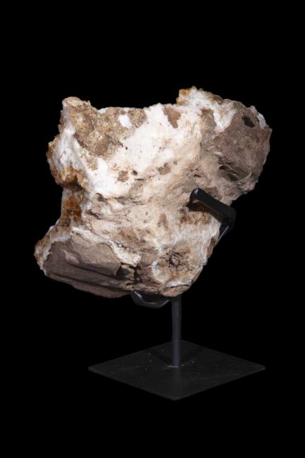 A CITRINE CRYSTAL GROUP ON DISPLAY STANDthe free form geode specimen mounted on a metal display stand,the geode 28cm wide, 35cm high ovearll