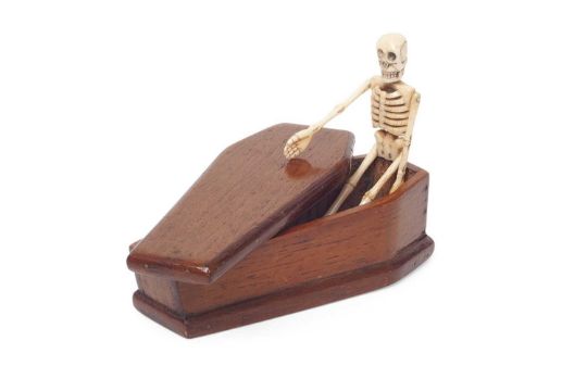 AN EARLY 20TH CENTURY MINIATURE BONE ARTICULATED HUMAN SKELETONprobably Prisoner of War work, the miniature skeleton fitting into the wooden coffin, the coffin inscribed to the inside of the lid 'august 10 1903',the coffin 13cm in length