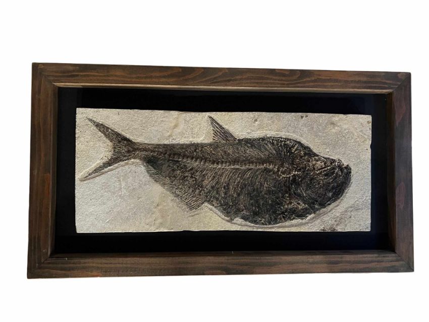 A FOSSILISED DIPLOMYSTUS FISH, 47 MILLION YEARS OLD APPROXIMATELYthe large fish fossil in a rectangular stone matrix, mounted in a wooden rectangular frame,the fossil 48 x 19, the frame 62cm wideDiplomystus Dentatus is an extinct genus of freshwater fish distantly related to modern-day herrings and sardines.