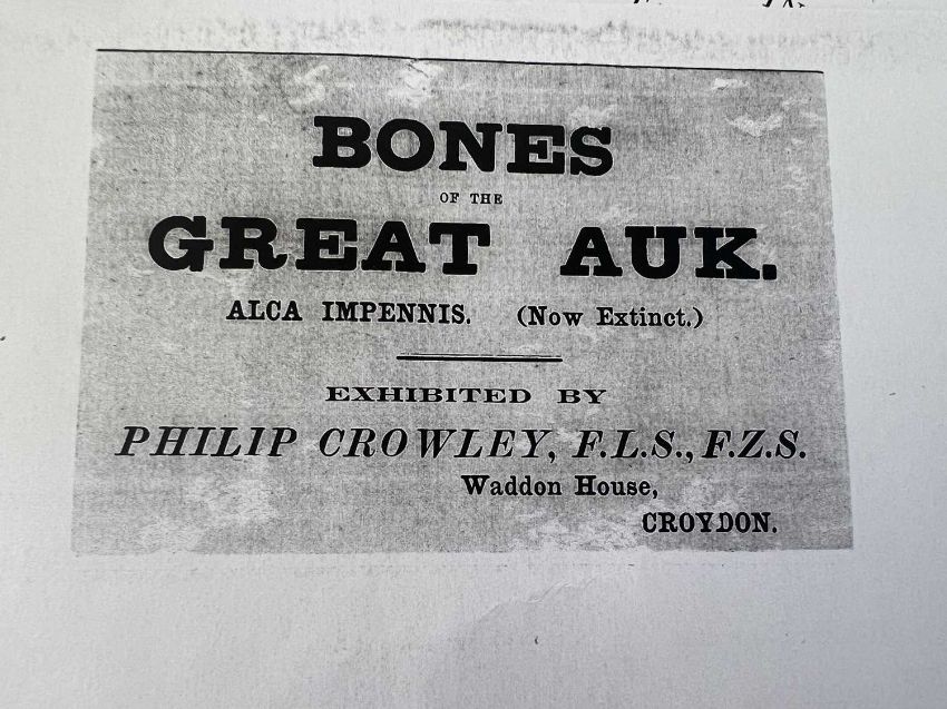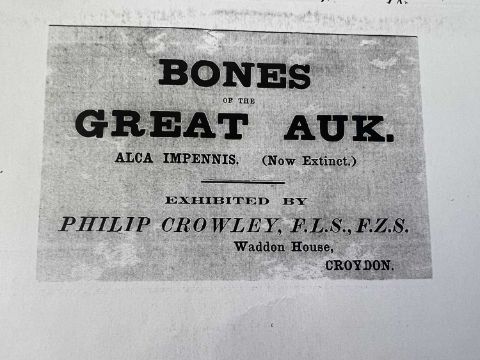 A RARE BONE OF THE EXTINCT GREAT AUK BIRD (PINGUINUS IMPENNIS)of Natural History interest, a rib bone, in a cardboard dipslay box, together with a certificate of authenticity recently prepared by Errol Fuller, with a photograph of the bone on the reverse, extinct since 1852,the bone 8.5cm in lengthProvenance: The Philip Crowley Exhibition.Great auks were killed by rapacious hunters for food and bait, particularly during the early 1800s. Enormous numbers were captured, the birds often being driven up a plank and slaughtered on their way into the hold of a vessel. The last known specimens were killed in June 1844 at Eldey island, Iceland. About 80 great auks and a like number of their eggs are preserved in museums.Errol Fuller is the author of the following:Extinct Birds, Oxford University Press, 2000The Great Auk, Abrams, New York, 1999,Dodo, Harper Collins, 2002,The Passenger Pigeon, Princeton University Press, 2014,Lost Animals, Princeton University Press, 2013.