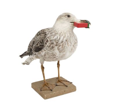 A TAXIDERMY SEA GULLthe full mounted seagull with painted wooden lolly in mouth, on faux sand base,38cm high