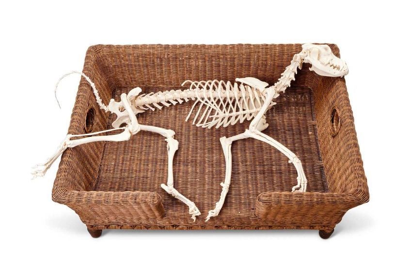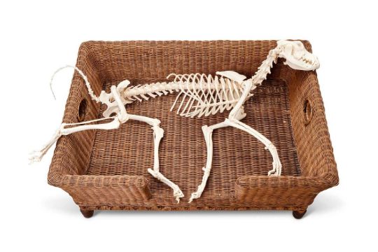 'LET SLEEPING DOGS LIE': AN ALSTATION SKELETON IN BASKETof Taxidermy / Osteology interest, the full specimen dog skeleton arranged in a rattan dog basket as if asleep,the skeleton 112cm in length