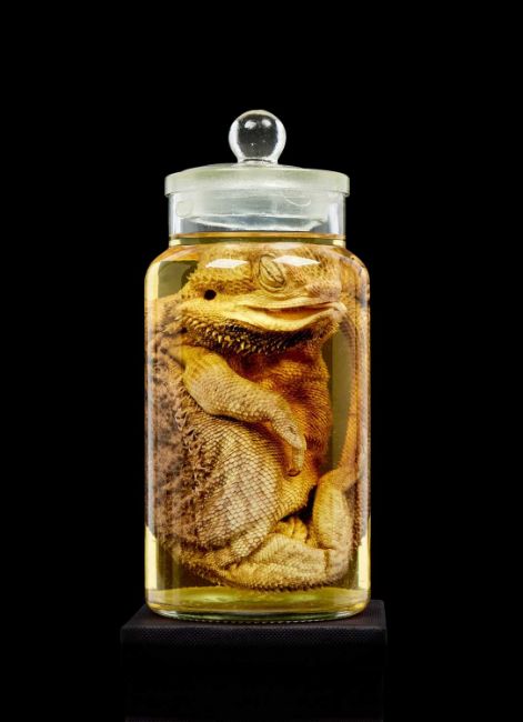 TAXIDERMY WET SPECIMEN OF A BEARDED DRAGONa central bearded dragon (Pogona vitticeps) preserved in alcohol in a glass jar.the jar 20cm high