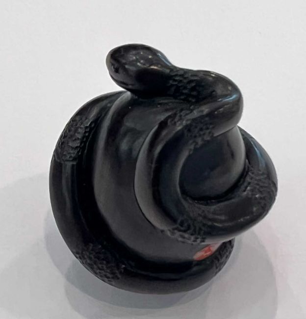 A CARVED WOOD NETSUKE IN THE FORM OF A SNAKEthe serpent emerging from an egg, with bone inlaid signature,4cm high
