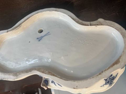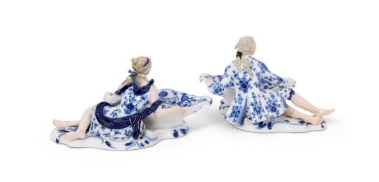 MEISSEN: A PAIR OF LATE 19TH CENTURY BLUE ONION PATTERN FIGURAL SWEET MEAT DISHESor salts, modelled with reclining courtly figures in 18th century dress, each holding a shaped oval dish, on Rococo style bases, decorated in blue and white Onion pattern, with blue crossed swords marks to the undersides. with incised number to the underside 2858 ad 2863,18.5cm high x 33cm wide (2)