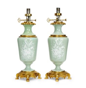 A PAIR OF LATE 19TH CENTURY CELADON PATE SUR PATE PORCELAIN AND ORMOLU MOUNTED LAMP BASESthe vases decorated with a floral sprays to both sides on a celadon ground, raised on Neo-Grec style ormolu bases and four feet, the upper sections with original fitments, now fitted for electricity,42cm high overall (2)