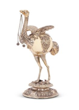 A LATE 19TH CENTURY SILVER MOUNTED OSTRICH EGG CUP AND COVER, PROBABLY HANAUin the Renaissance Revival style, modelled as an ostrich, the standing bird holding a pierced shield depicting a winged herm figure from three chains hung from its beak, flanked by filigree balls, the upper section of the egg cut and mounted with open-work decoration and the wings, with further pierced Renaissance style mounts to the body, the legs and tail naturalistically modelled, and raised on a stepped, circular base cast with lizards, a frog and snail, the lower section with cartouches flanked by C scrolls and fruit, one cartouche marked with a sickle mark, 2580 grams (91 oz) in weight,48cm highFirst conceived in the 16th and 17th centuries, the idea of an ostrich formed from the actual egg of the bird appealed to collectors and patrons of the period who were seeking unusual, opulent and thought provoking wonders for their cabinets of curiosity or wunderkammers. The idea was reinvented in the 19th century by many silversmiths and goldsmiths, including Faberge.