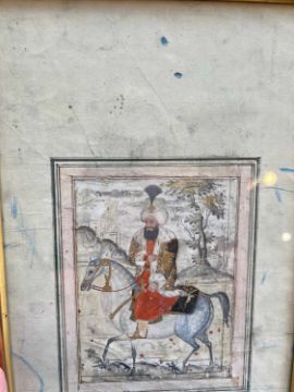 AN 18TH / 19TH CENTURY PERSIAN GOLD LEAF AND WATERCOLOUR PAINTING DEPICTING SULTAN SULEIMAN II OF THE OTTOMAN EMPIREthe Sultan richly dressed in a gold and ermine coat, riding a white stallion with gold bridle and stirrups, in a landscape with tree and palace behind, in a rectangular black ink border, on paper, the painting laid over the larger sheet of paper and a border drawn around the edge, mounted in a later gilt and glazed frame,the painting 19cm x 15cm, the frame 35cm x 24cm