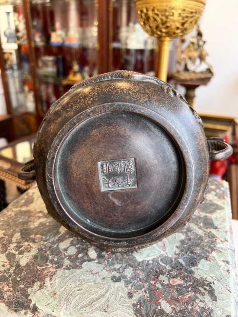 A CHINESE BRONZE ELEPHANT HANDLED CENSERdepicting 'Chi-Dragon' in relief to the body, raised on a circular foot, the underside bearing 'Ming Xuande' style mark,22cm wide x 10.5cm high