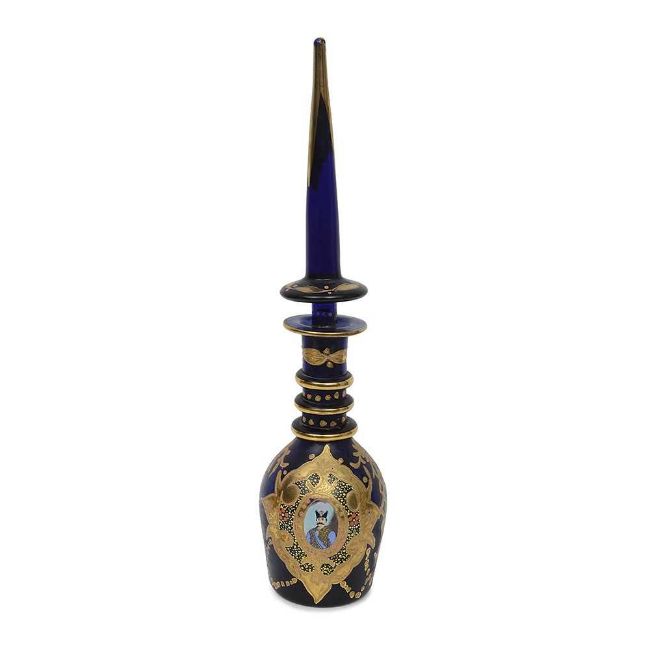 A PERSIAN BLUE GLASS AND GILT DECORATED DECANTERof baluster form with spire stopper, with gilt borders and decorated with a portrait of the Qajar ruler Nasr Al Din Shah,44cm high