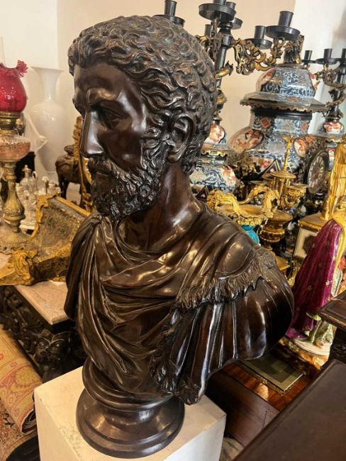 A LIFE-SIZE BRONZE BUST OF ROMAN EMPEROR MARCUS AURELIUSwearing a toga fastened at his right shoulder, raised on a cylindrical socle, mid brown patination,73cm high