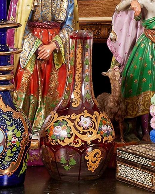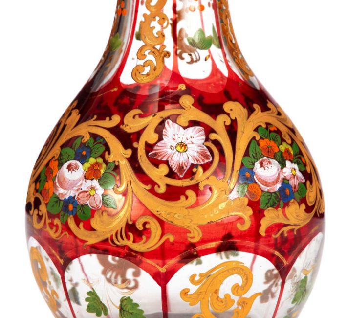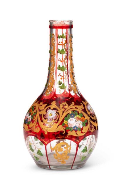 A 19TH CENTURY BOHEMIAN RUBY GLASS VASE OR HOOKAH BASE FOR THE PERSIAN / OTTOMAN MARKETof baluster form with elongated neck and circular foot, with ruby glass enamelled with floral decoration and heightened in gilt with scrolling foliage,26cm high