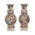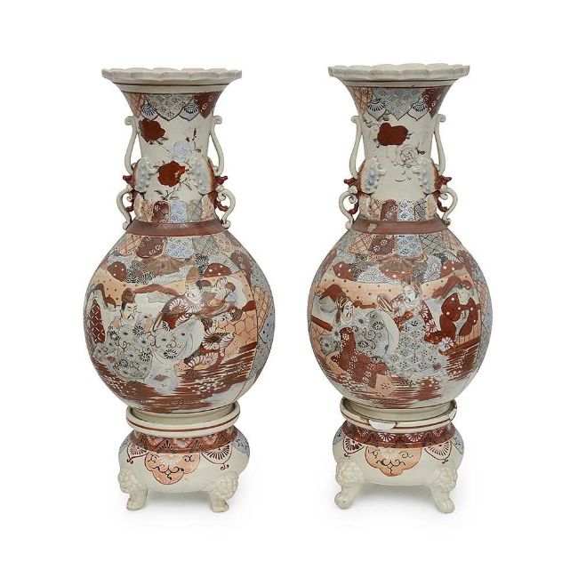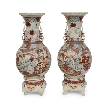 A LARGE PAIR OF JAPANESE MEIJI PERIOD SATSUMA POTTERY VASESlate 19th / early 20th century, with scallop edged rims over long necks and baluster bodies, on circular feet, with typical decoration of figures, marked to the undersides, on separate plinths raised on four scrolling feet, (one plinth chipped),59cm high (2)