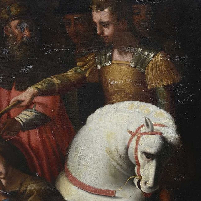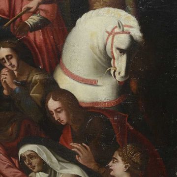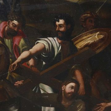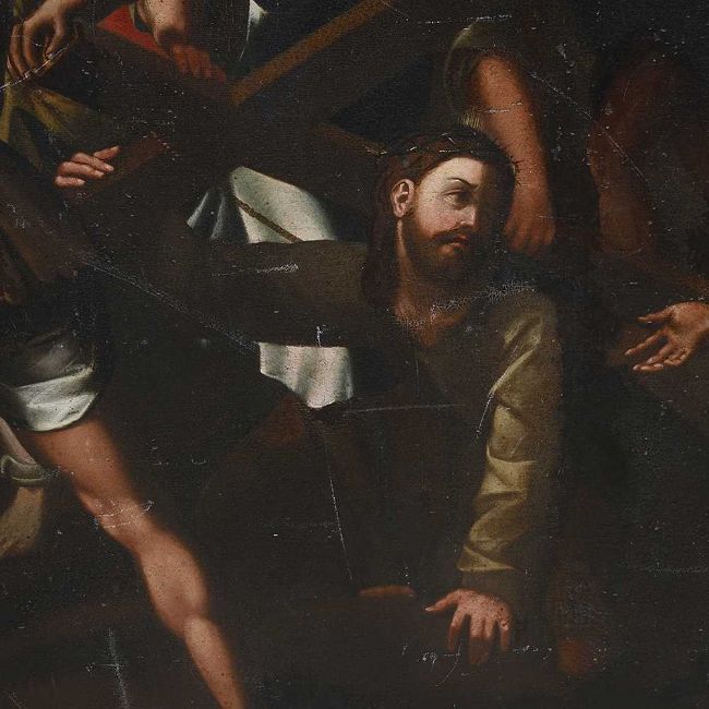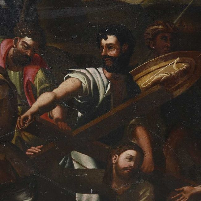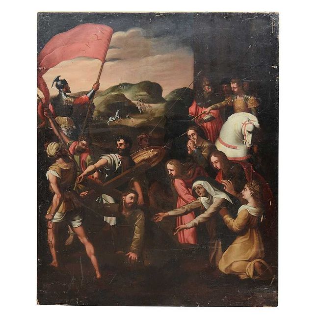 A LARGE 17TH / 18TH CENTURY PAINTING OF CHRIST FALLING ON THE WAY TO CALVARY AFTER RAPHAELoil on canvas (re-lined), after Raphael's painting also known as Lo Spasimo or Il Spasimo di Sicilia, circa 1514-16, depicting Christ Carrying the Cross to his crucifixion, at the moment when he fell and his mother suffers a spasm of agony, the Swoon of the Virgin, or "Lo Spasimo", Simon of Cyrene lifts Christ's cross momentarily and looks sternly at the guards, the four Marys are depicted on the right side of the painting and towering on either side of the composition are the guards, unframed,135cm x 104cmThe original is now in the Museo del Prado, Madrid.The concept of, and devotion to, the "spasm" of the Virgin was fashionable, if somewhat controversial, in early-16th-century Catholicism, although in this work the Virgin has only fallen to her knees, not collapsed or fainted, as is often shown.