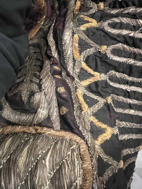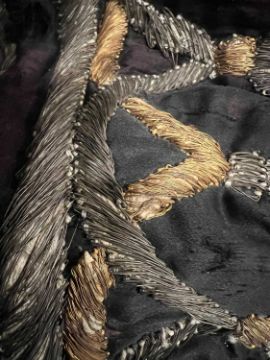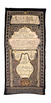A 19TH CENTURY OTTOMAN SILVER THREAD AND SILK EMBROIDERED QURANIC CURTAINthe black ground profusely embroidered in silver thread, with applied panels in pink and gold coloured silk, the upper section with a banner of Islamic text, over a shaped panel resting on a pair of columns, with an embroidered tassel design at the base, the texts would have continued on other curtains and contain passages from the Qur'an, the top panel Qur'an, chapter II (al-Baqarah), part of verse 125 and part of verse 260 and chapter III (Al 'Imran), part of verse 96 in the middle panel; and Qur'an, chapter XVII (al-'Isar'), verse 84 in the lower panel with 'God, exalted be His glory' and 'Muhammad, God bless him and grant him salvation' in its top corners, on later velvet backing, 263cm x 119cm The text translates as follows:and when we made the house [Mecca]and when Abraham said "my lord, now show me how you give life to the dead"the first house of worship established for mankind [Mecca]say, each works according to his manner, but your lord is most knowing of who is best guided in wayEach of these sections starts with the blessing "bismillah al-rahman al-rahim" and the words "allah" and "muhammad" have sections on either side of the lowest panel.Foonote:The design of this curtain is typical of the embroideries produced in the period of Sultan Mahmud II, the pair of columns, architectural features and interwoven flowers are characteristic of the style of this era. Curtains of this type were used to cover the interior walls of the Shrine of the Prophet in the Mosque of the Prophet and other mosques. Those from the Mosque of the Prophet were replaced upon the ascension of a new Sultan to the throne, they were then used to cover the tombs of the Sultans or distributed amongst favoured dignitaries.Auction Comparable:See Sotheby's, 24 October 2007, lot 39 for similar curtain sold for £356,000, a Sotheby's, 9 April 2008, lot 40, £168,000.