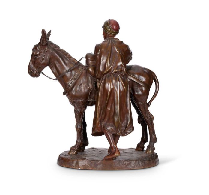 ANTOINE BOFILL (1875-1939): A LATE 19TH CENTURY ORIENTALIST BRONZE 'ANIER DU CAIRE'depicting an Egyptian scene of an arab man and donkey, finely patinated with reddish hues to his clothes, on a naturalistic, oval base, signed 'A. Bofill', and with 'BRONZE GARANTI' pastille mark, with name plate to the front inscribed 'ANIER DU CAIRE', 47.5cm high