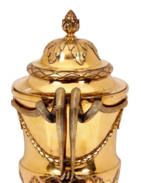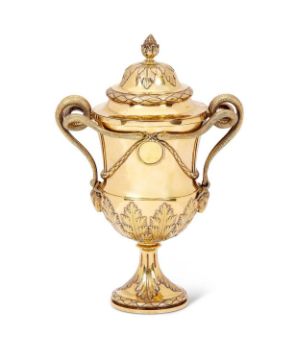 A GEORGE III STERLING SILVER GILT CUP AND COVER, LONDON, 1774, PARKER & WAKELINin the Neo-Classical style, the domed over with fruiting finial over acanthus leaves and a stiff leaf cast border, the cup with twin, entwined serpent handles terminating in rams masks, the body centred by a roundel hung from foliate, ribbon-tied garlands, the base with acanthus leaf decoration, raised on a spreading, circular foot, the interior also gilded or vermeil, the underside and cover both hallmarked and with maker's mark for John Parker I & Edward Wakelin, 2715 grams (95oz),39cm high